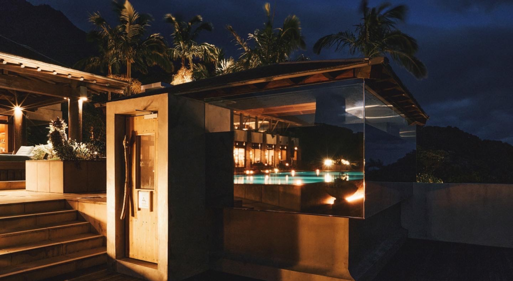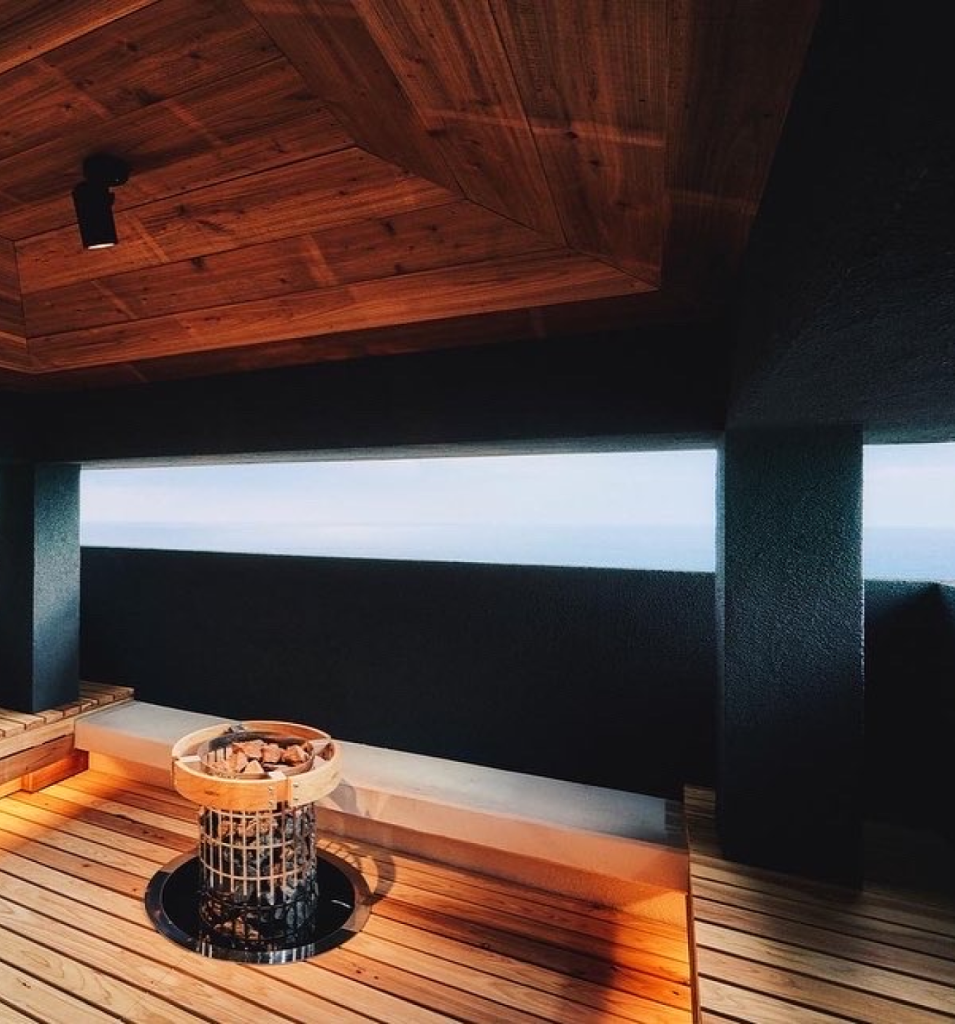 Produced bar hut facing the hotel pool. It is a one-of-a-kind sauna that immerses visitors in three views: the ocean, the mountains, and the pool. The pool is normally closed in winter, but by producing a sauna, the objective was to increase the number of users regardless of the season and rebrand the hotel.
