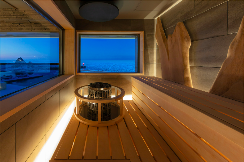 サウナ室は、流氷をイメージした『KAKUUNA(カクウナ)』と木の洞窟をイメージした『UNEUNA(ウネウナ)』の2種類。「UNEUNA」のうねりは世界でも珍しい3D加工で木材を削り出して曲線を型取っている。また、チラーの導入により最適の温度に保たれた水深90cmの水風呂や、充実した外気浴・内気浴スペースもあり、屋上には「UMISORA(ウミソラ)外気浴」と呼ばれるインフィニティチェアを並べたスペースも用意し、隅々までこだわった。